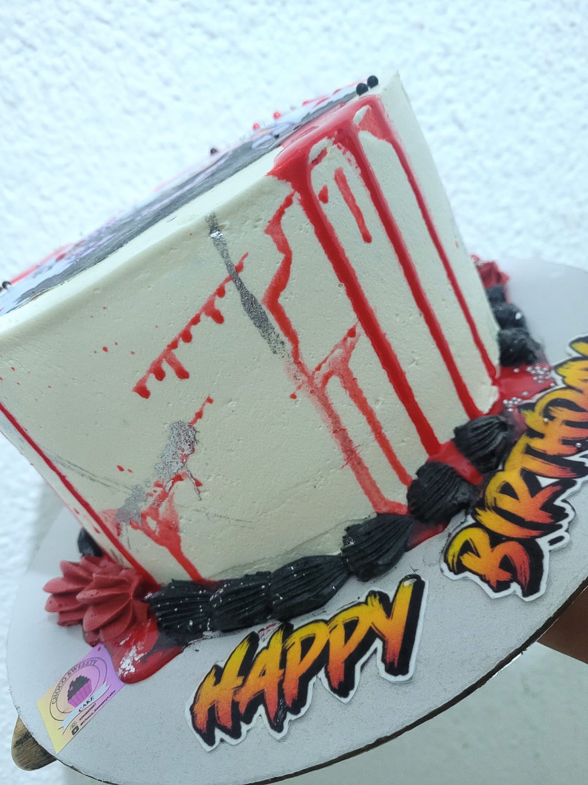 Tres ponqués de chocolate , dos rellenos de ganache de chocolate, vestida de crema de vainilla ,colores blanco , negro y cortina roja, anime en papel de arroz, topper feliz cumpleaños, siempre el diseño y motivo puede variar . PORCIONES 30 a 35