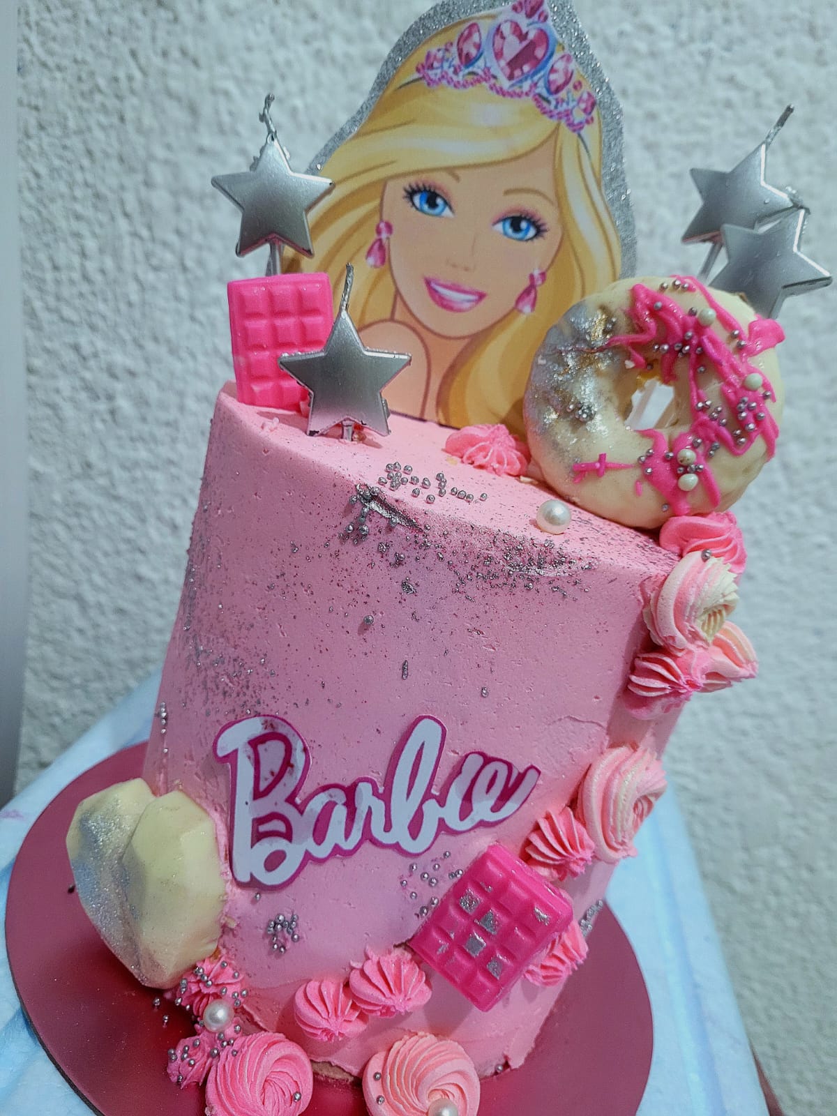 Tres ponqués húmedo de vainilla , dos rellenos de frutas y dulce de leche, vestida y decoración de crema rosa, barbie, bombones y cuadros de chocolate blanco, dona, velas en forma de estrellas y sprinkles. PORCIONES 15 A 20