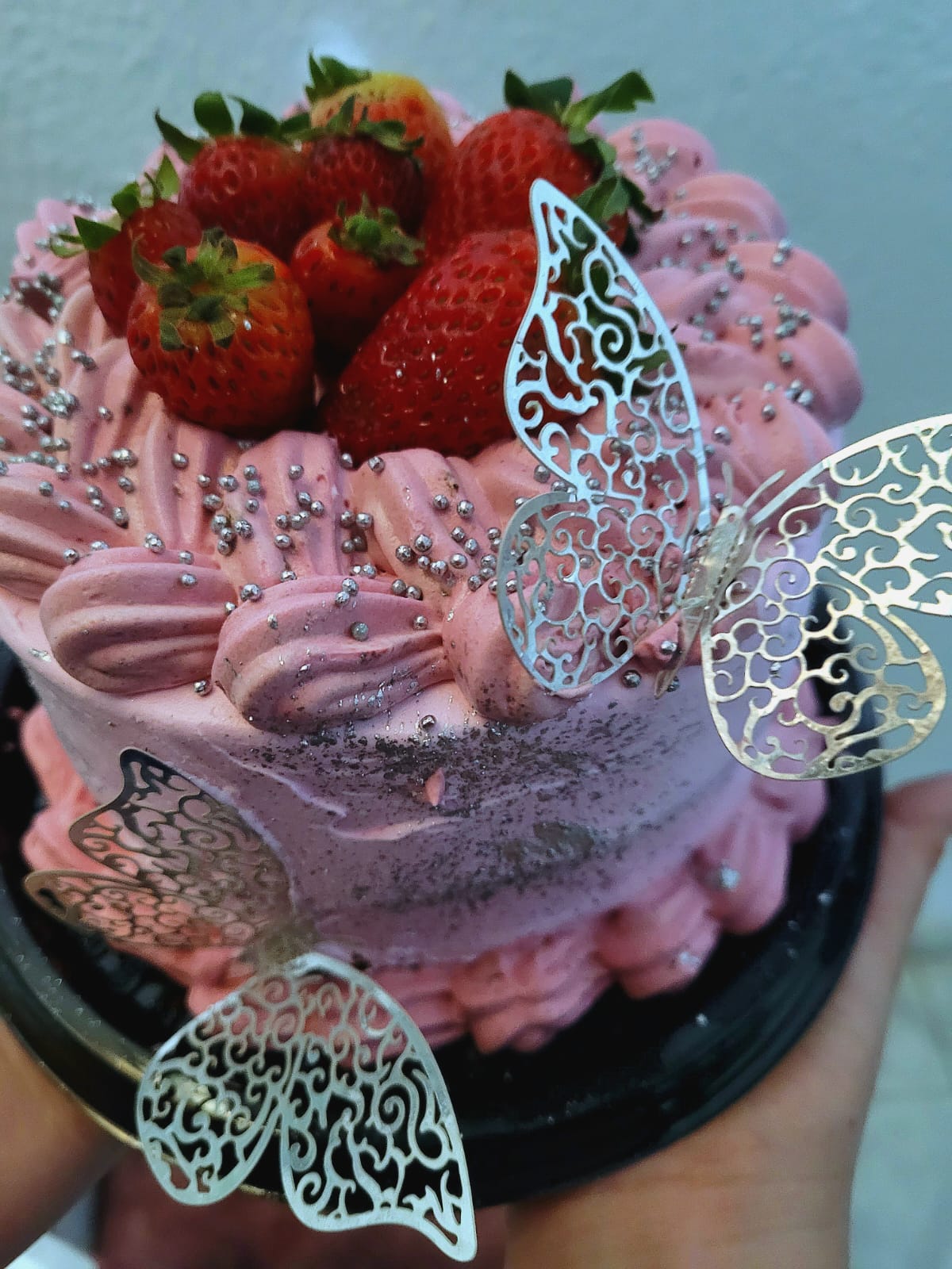 Dos ponqués de vainilla, relleno de frutas, vestida de crema de vainilla y queso crema, decorado en trenzas color rosa, sprinkles, fresas y mariposas. la decoración y sabor puede variar. PORCIONES 10